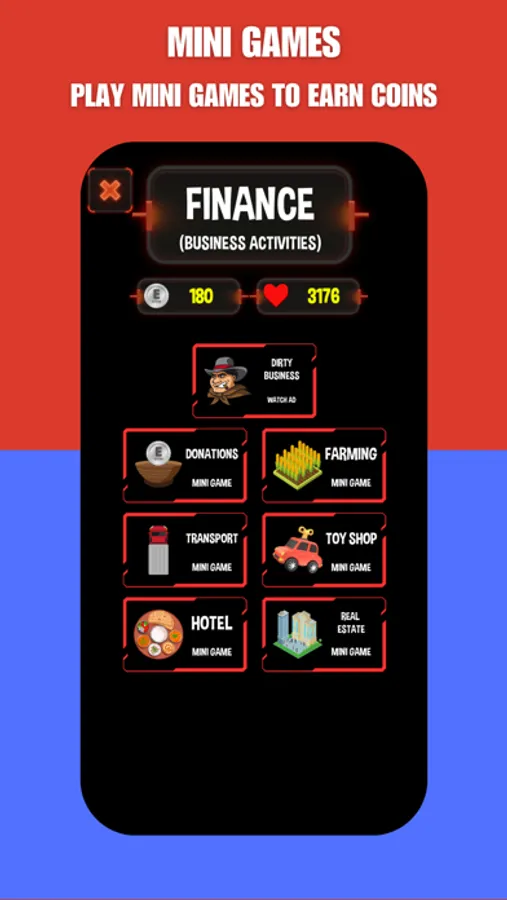 User can earn coins by doing business. Business or Finance section contains 6 mini games. These mini games are of clicker and hyper casual category. User can earn coins by playing these mini games.