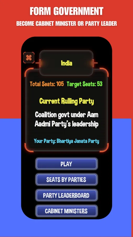 The goal of user is to gain control over more than half constituencies. Any Party which gains control over more than half of the constituencies forms the government in that map. Top 10 Players of that party become cabinet ministers. Top player becomes chief minister. If no party gains more than half constituencies then a party which has more seats forms a coalition government. There is also a party leaderboard. Top 10 Players of party enters into party leaderboard.