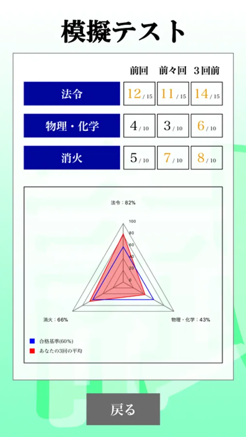 本アプリの学習の流れですが、前半に物理・化学、消火、法令と順に進めていきます。後半からは3つのジャンルを並行して学習し定着を図ります。