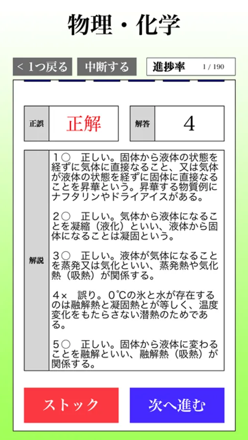 学習の後半に入ったら、適宜模擬試験を行い、自分の実力の把握を行ってください。物理・化学または法令がネックになる方が多いと思います。苦手なジャンルはジャンル別のストック機能を活用して勉強してください。