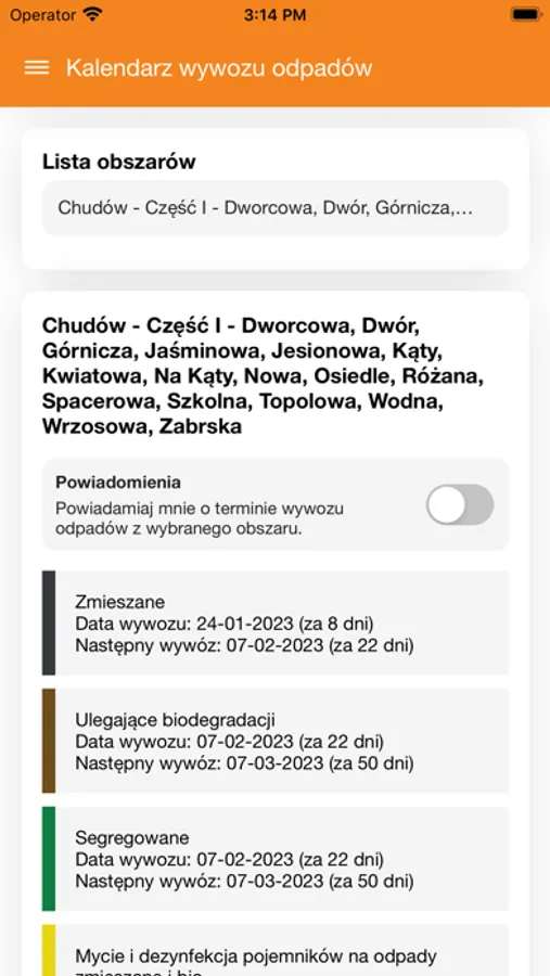 Aplikacja przypomni o terminie odbioru poszczególnych odpadów, poinformuje o zasadach prowadzenia selektywnej zbiórki odpadów, powiadomi o aktualnościach związanych z tą tematyką. Moduł umożliwia dodatkowo wysyłanie reklamacji odnośnie braku odbioru odpadów, uszkodzonego pojemnika lub innych sytuacji.