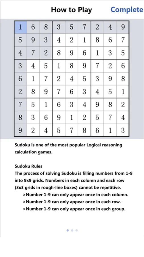 The process of solving Sudoku is filling numbers from 1-9 into 9x9 grids. Numbers in each column and each row (3x3 grids in rough-line boxes) cannot be repetitive.