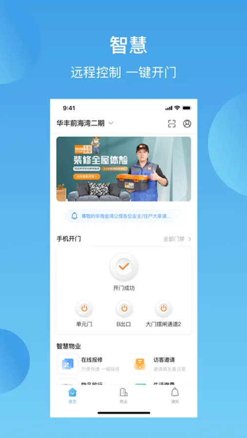 华丰前海湾社区集物业服务、便民服务以及邻里互动等功能于一体的生活服务APP。包括物业缴费、报事报修、停车缴费、访客邀请、远程开门、租房信息发布、社区商城、社区互动等功能。