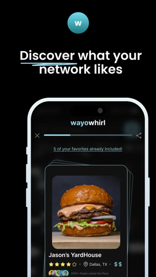 Wayo is THE destination for discovering your next favorite place, restaurant, bar, or activity. Wayo delivers personalized recommendations to you based on your own interests and your network’s preferences. You’ll never have to rely on generic recommendations again. Stop searching endlessly online for that perfect recommendation - let Wayo do the work for you!