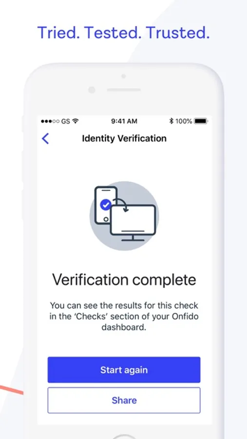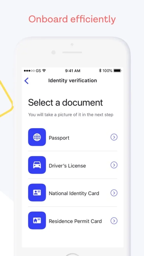 Experience the on-boarding journey offered by Onfido. You’ll be asked to take a photo of your ID document, and a short selfie video.