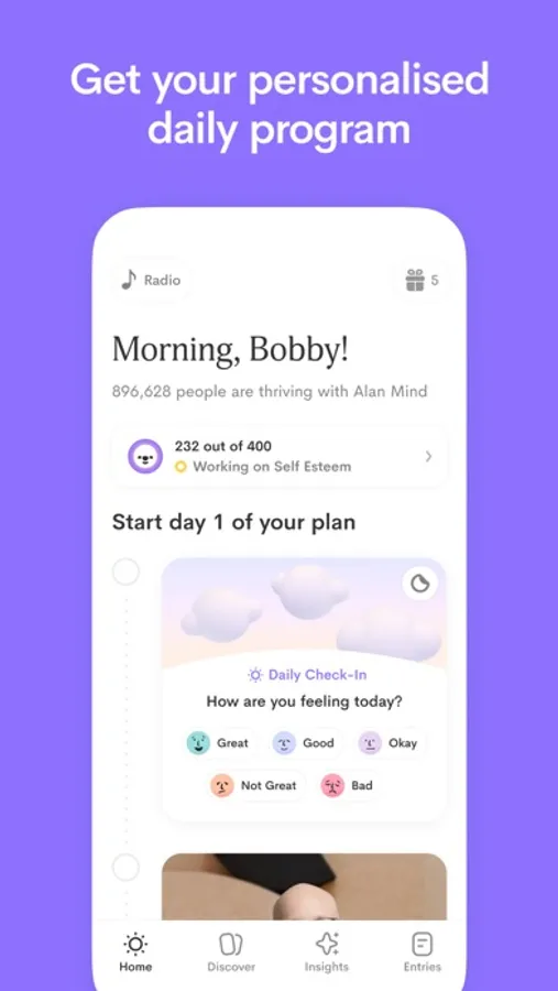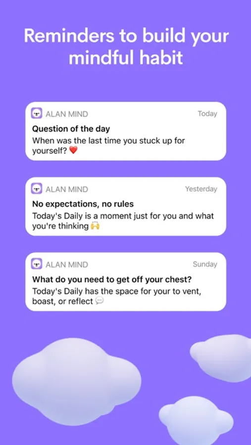 "This is my go-to app in the morning and at the end of my day. It's more than a journal it is close to a personal therapist" — Meet Alan Mind, the most loved journaling app. 20k reviews. 4.9 stars.
