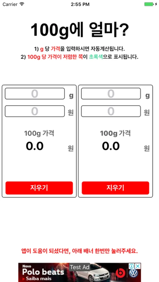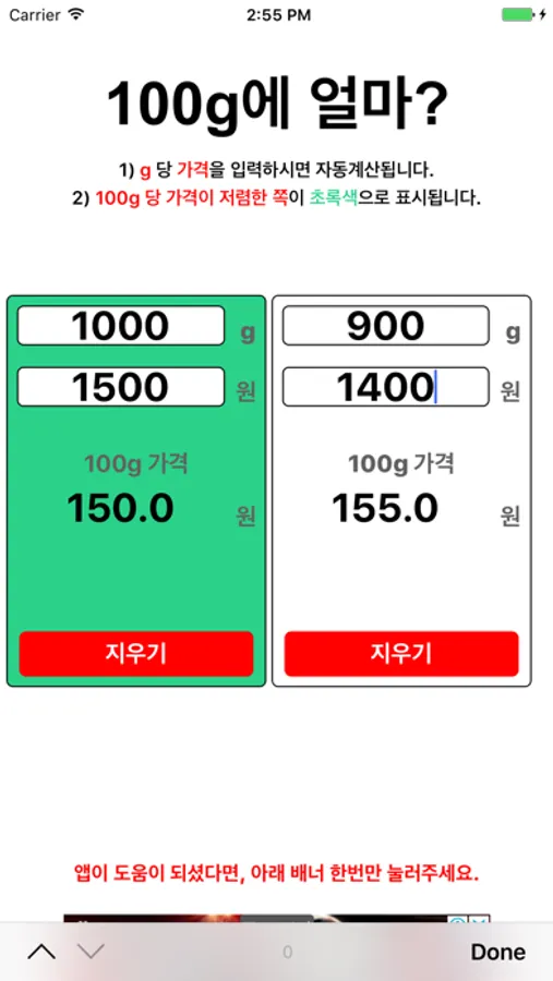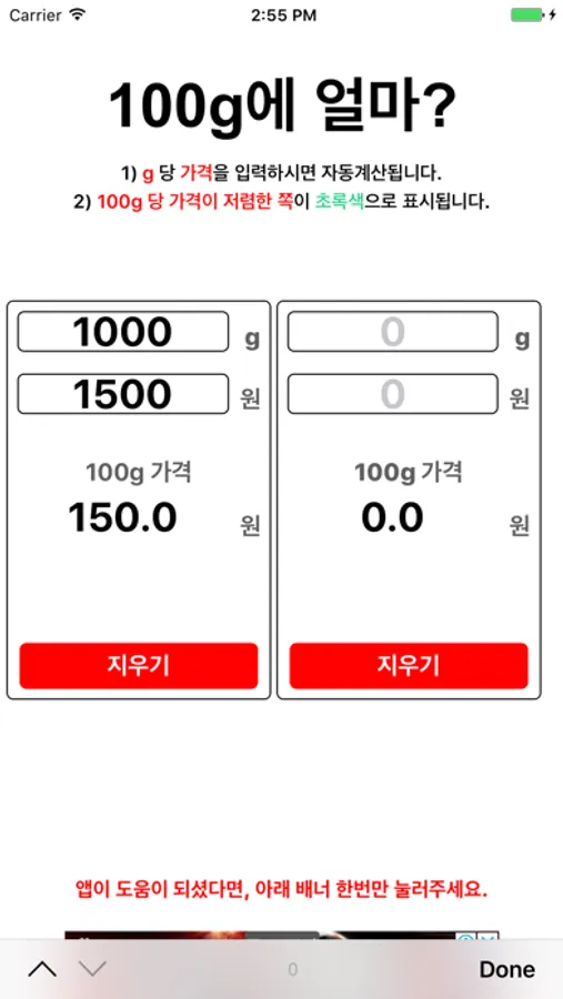 2. 가격이 100g당 가격으로 자동 계산됩니다.