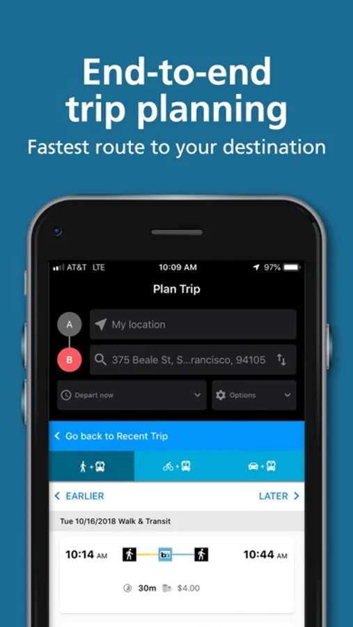 -Plan your entire end to end trip with BART’s exclusive Trip Planner giving you the fastest route from your starting point to your destination using BART and multiple modes of transportation, including connecting transit, biking, walking and driving.