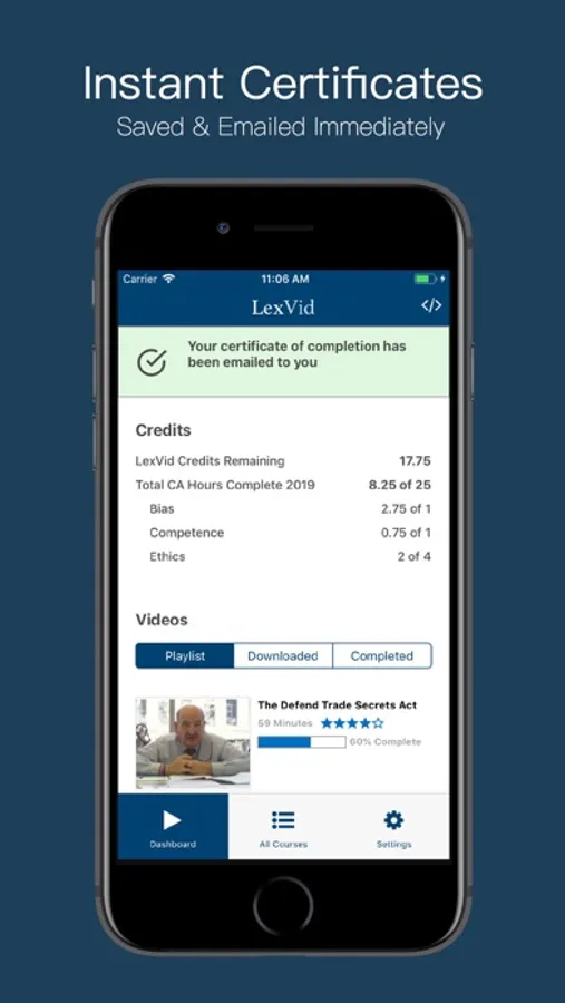 Any LexVid member can use the LexVid app to stream or download CLE videos, and earn credit anywhere, anytime in every state where LexVid courses are accredited.Watch courses on your iPhone, iPod, or iPad. Download your courses ahead of time and earn CLE while on a plane or traveling without internet connection. Certificates are email, and credits are automatically reported once you're back online.