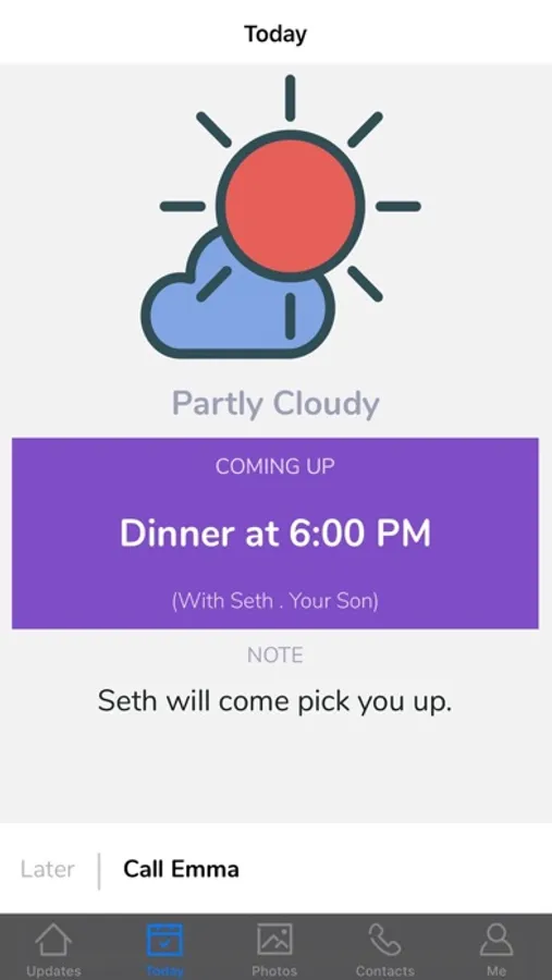 * Today - Helps the patient stay informed of daily information such as the date and time, weather conditions, as well as their upcoming events and appointments for the day.