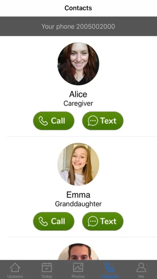 * Contacts - Allows the patient to call or text a loved one at the tap of a button, without having to remember any phone numbers. It also reminds the patient if they are repetitively calling.