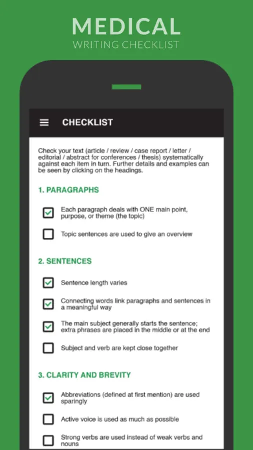 The Medical Writing Checklist was developed in response to a specific request. PhD students attending a medical writing course wanted an overview of the main points so they could quickly check through their work and make sure they hadn’t missed anything. This customized list meets their requirements. The items in question are included under the following headers: