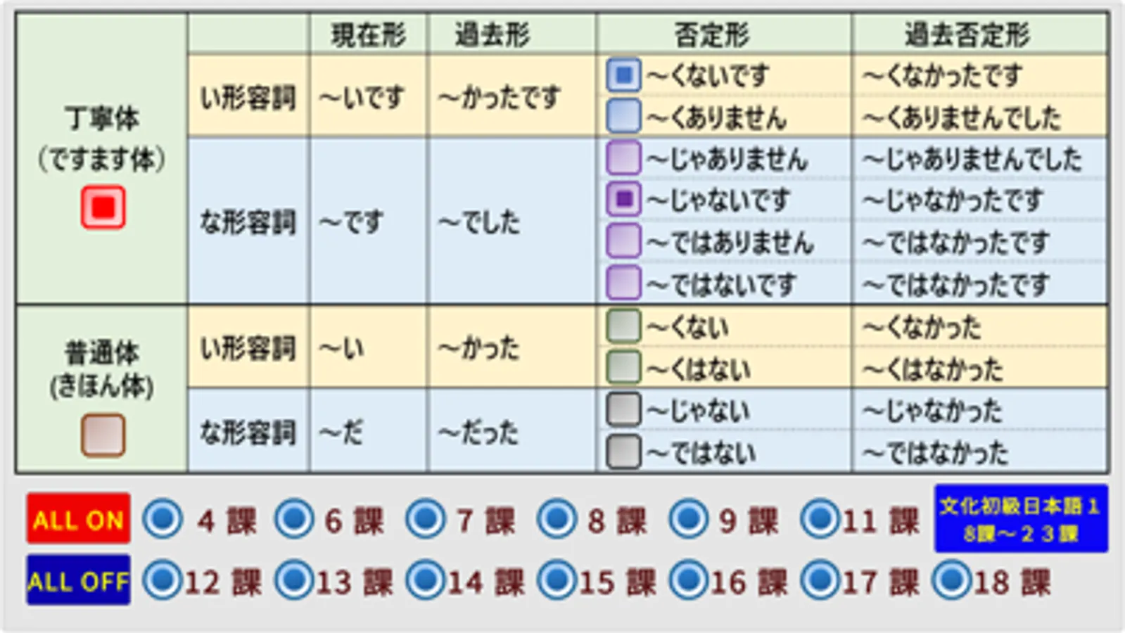 ・設定画面下部にあるラジオボタンで「表示する課」を選択してください。複数又はすべてを選択することが可能です。形容詞の新出がない課(1〜3課、5課、10課)はありません。