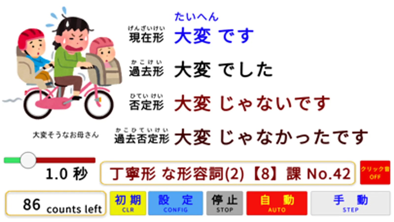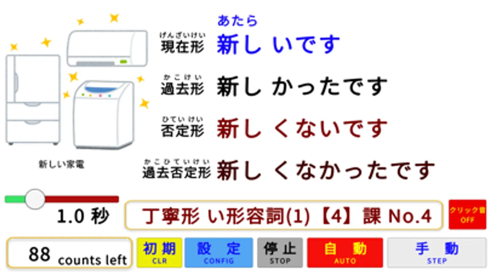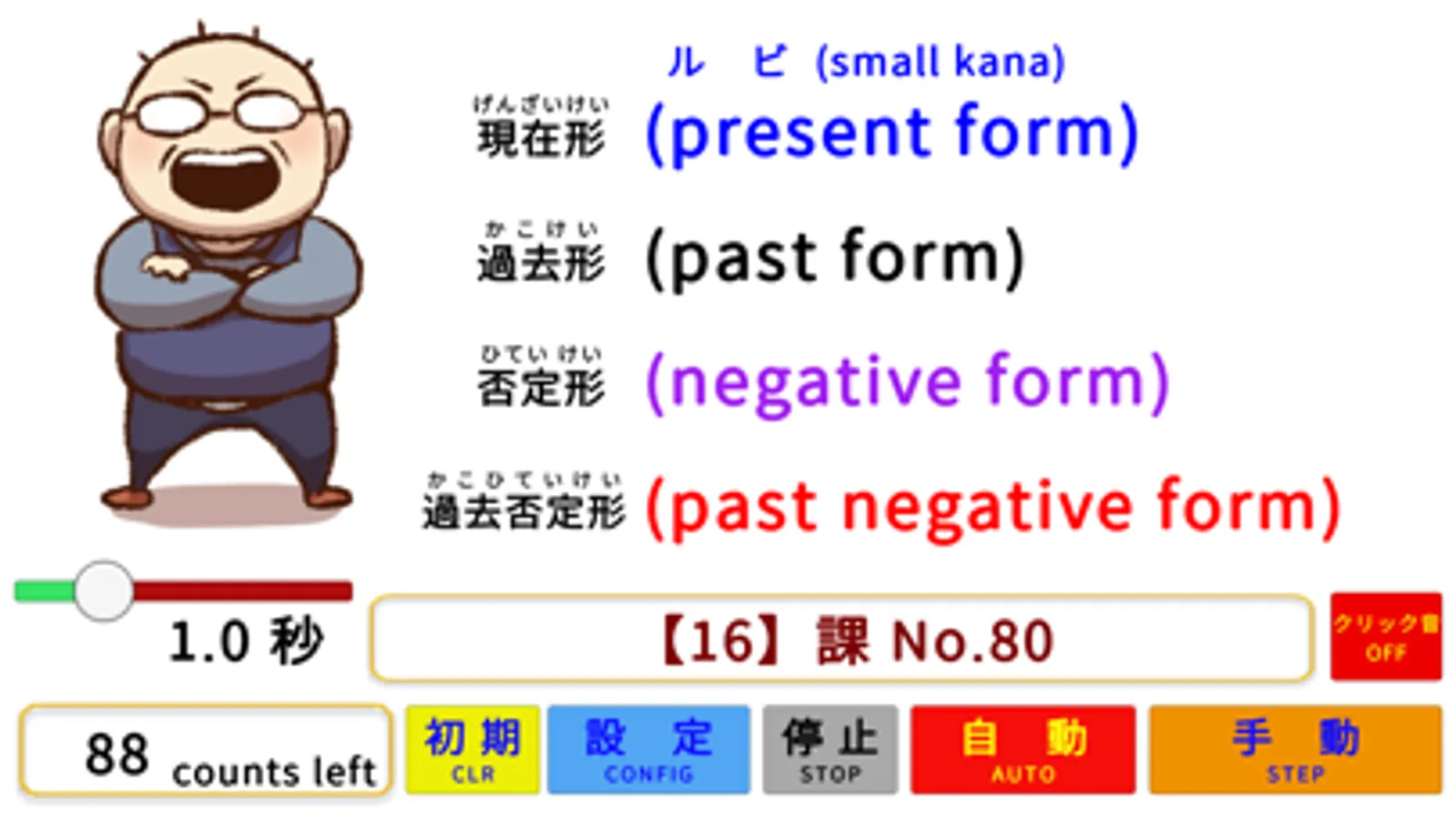 ・表示は上から「現在形」「過去形」「否定形」「過去否定形」の順で1秒毎で表示されます。