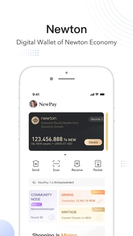 NewPay, the digital wallet of Newton Community Economy, is the centerpiece of Newton's ecosystem. In NewPay, users can manage digital assets, pay and transfer NEW, vote to participate in community governance, contribute to Newton and get NEW incentives, and build Newton Community Economy together.