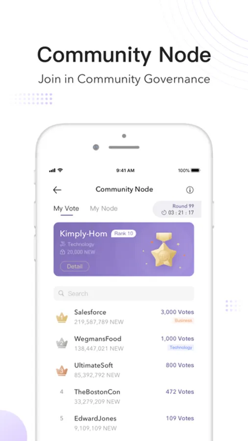 Vote for a community node or become a community node candidate to take part in community governance and receive incentives in NEW.