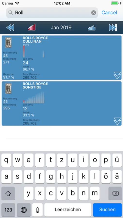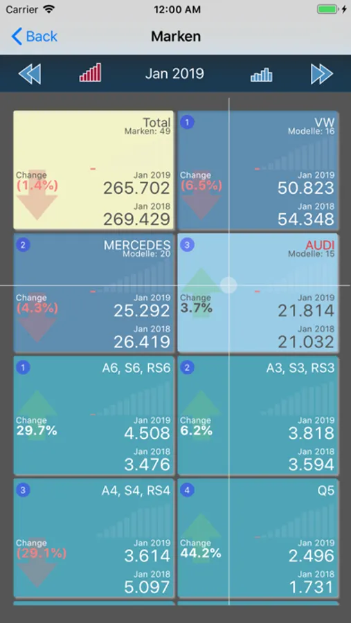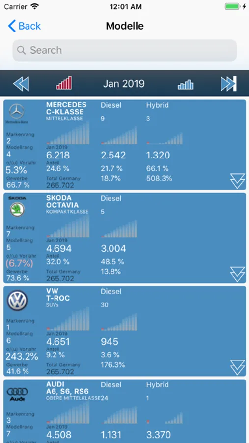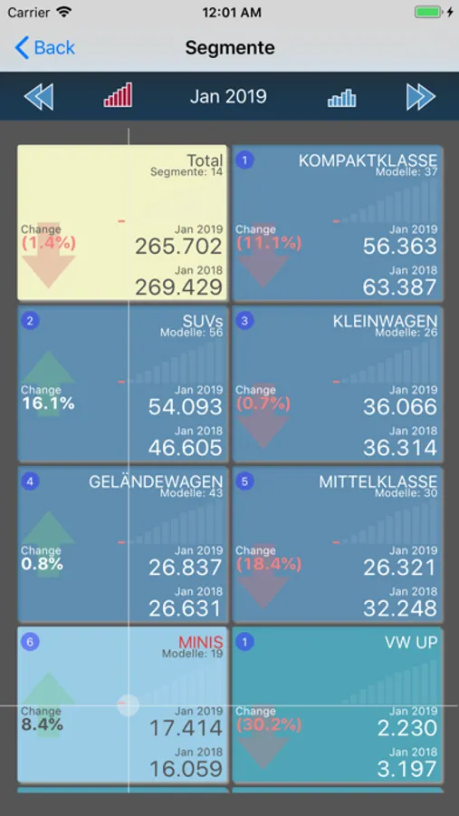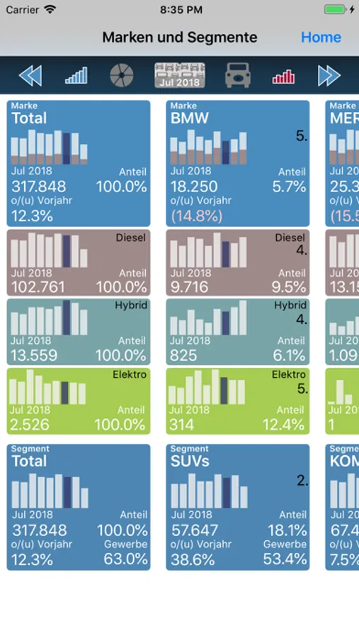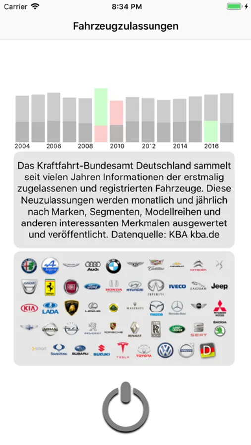 Die iOS Anwendung visualiert die Auswertung der monatlichen und jährlichen Pkw Neuzulassungen in Deutschland nach folgenden Kategorien: Segmente, Marken und Modellreihen. Die wichtigsten Erhebungsmerkale bei den Aufbereitungen sind: