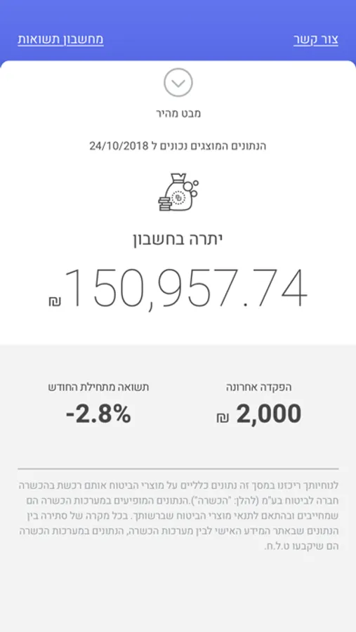 באפליקציה יש את האפשרות למבט מהיר המאפשר למשתמש לצפות בנתוני ההשקעות בכל רגע נתון ללא צורך בהזדהות.