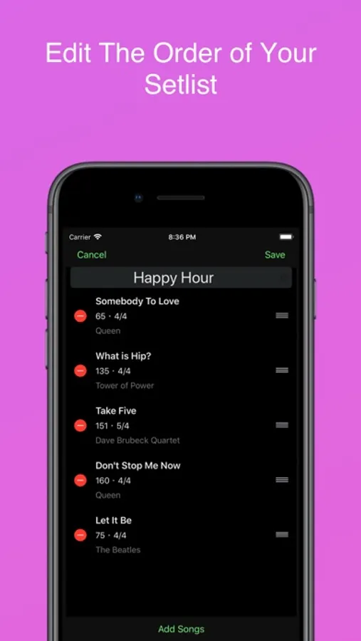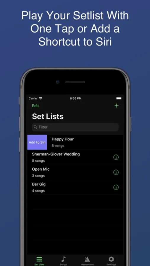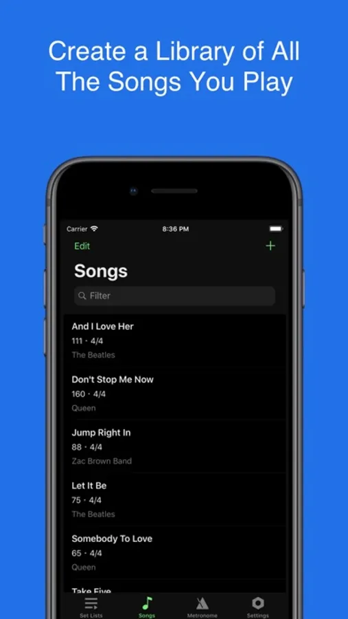 Ever feel like you count off the song too fast? You practiced it perfectly, but the adrenaline at the gig makes you just take off running. Count It Off makes it quick and easy to see what your next song is and what tempo you chose when you were practicing. Count off that song with perfect time, every time. You can even get the tempo on your Apple Watch!