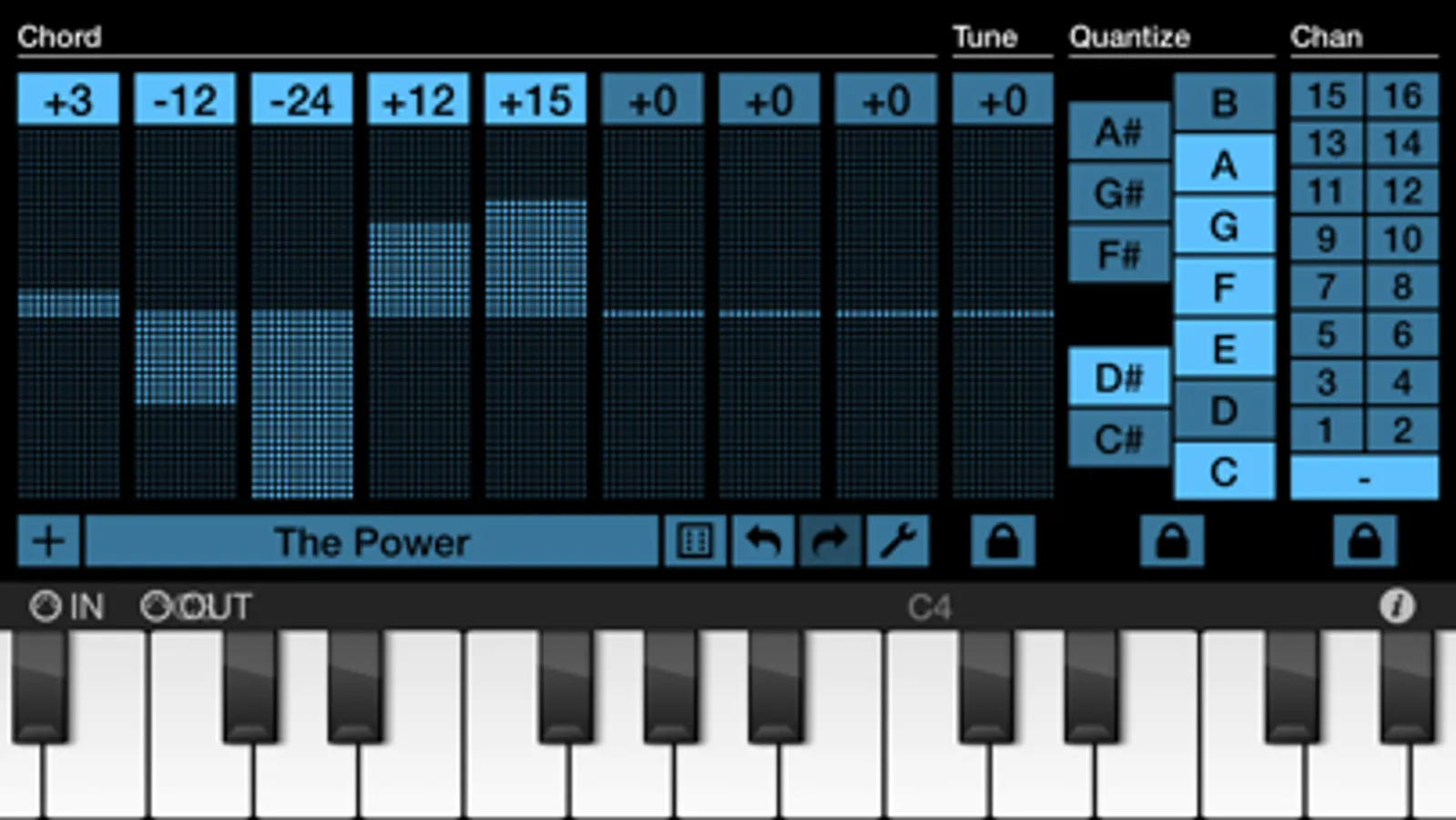 The chord is generated by adding up to 8 transposed notes to the original note played. Once the chord is generated, it is quantized to limit it to the selected output scale.