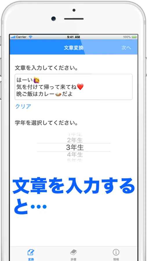 ■文章を入力して学年を選択すると、習っていない漢字を自動的にひらがなに変換します。