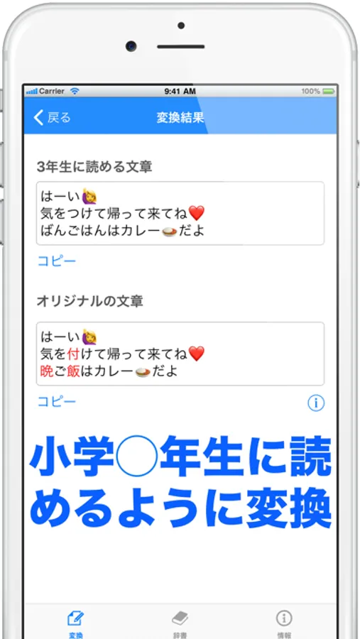 ■変換結果はクリップボードにコピーでき、お子様とのLINEやiMessageにペーストできます。
