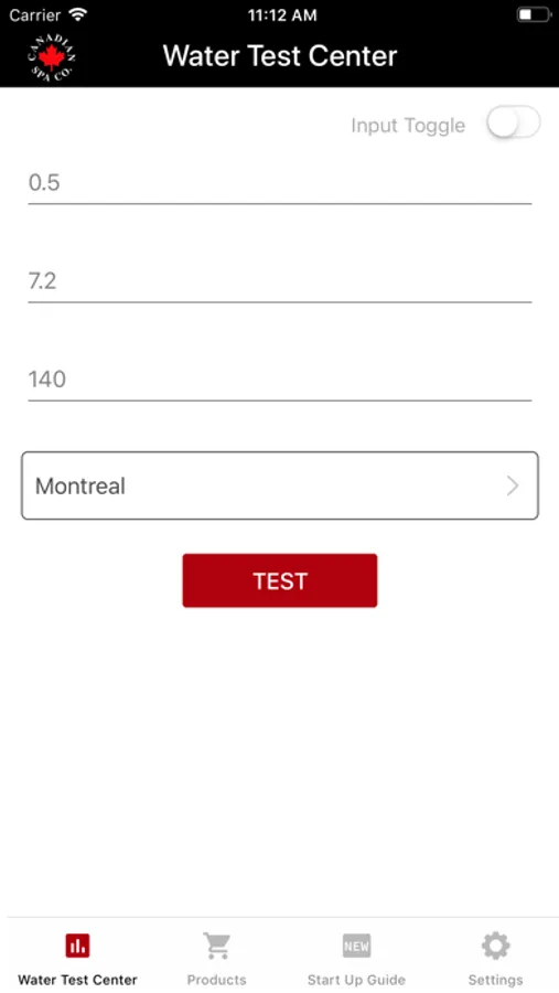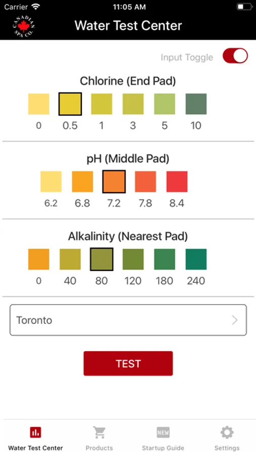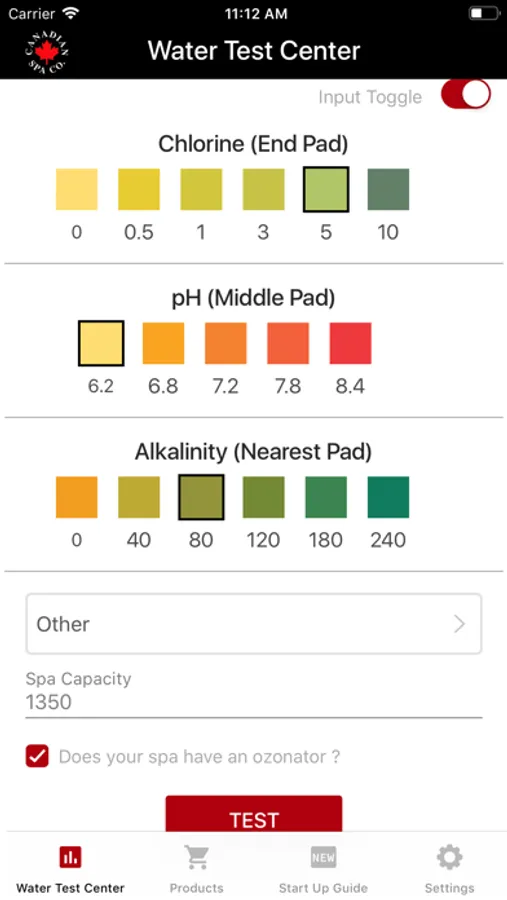 → A easy to use colour selector screen based upon the results from Canadian Spa test strips