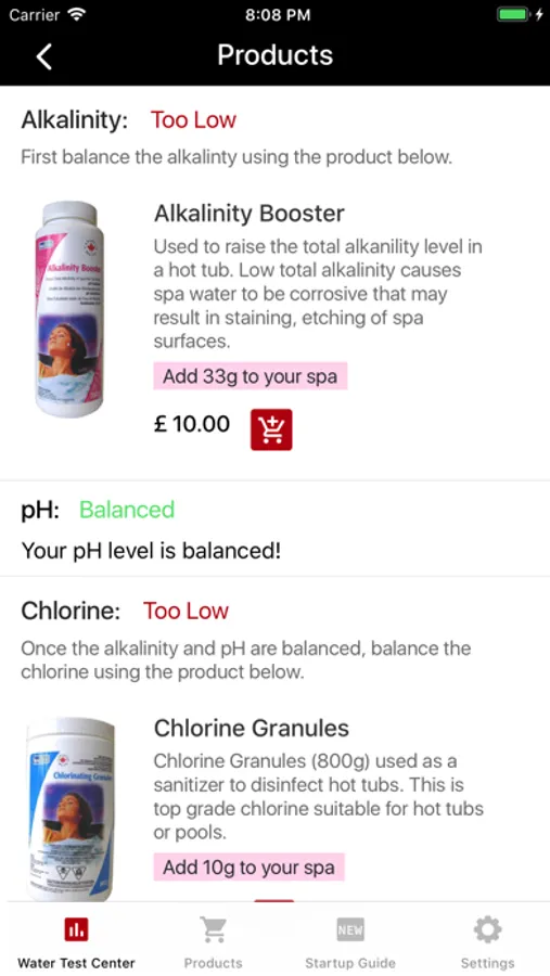 Simply dip your test strip into your spa water and enter the colours shown into the 'Water Test Centre' screen of the app. Instantly you'll have the list of products and the quantities of the products needed to balance the alkalinity, pH and chlorine levels in your spa.