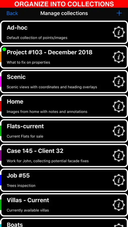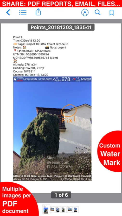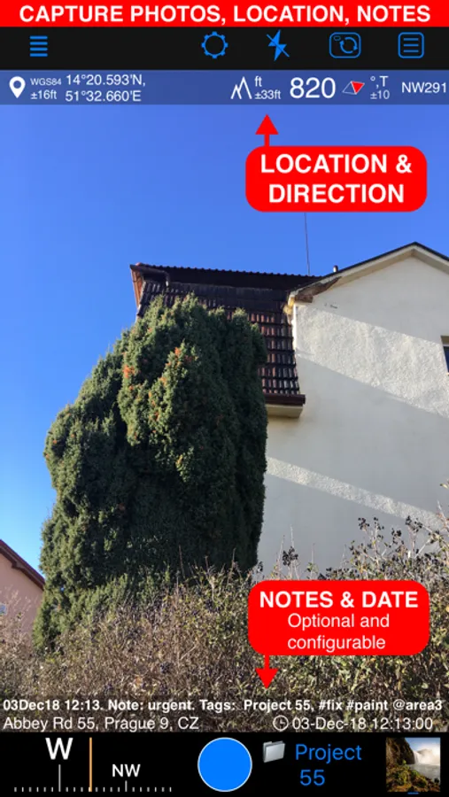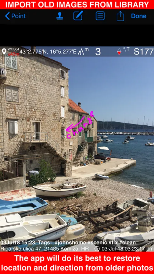 Capture and stamp photos with location, date, address, notes. Add hand drawn annotations. Search & filter your images by title, notes, tags or sort by proximity and date. Organize into collections/folders. Import existing photos from the photo library to restore their location, direction and even notes.