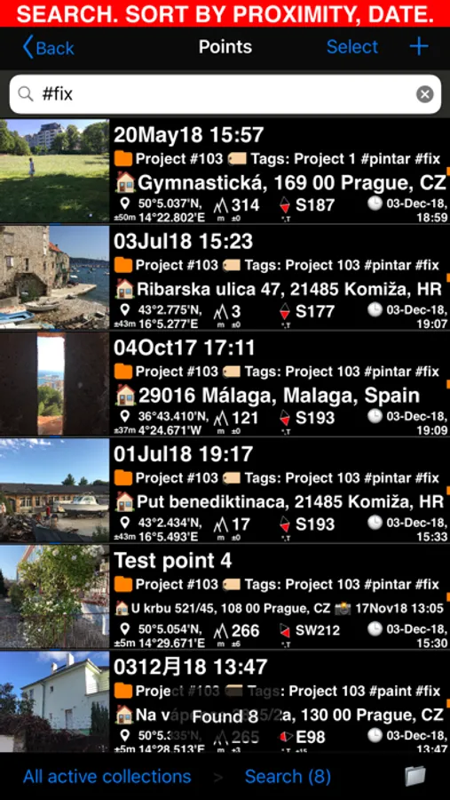 MENU > POINTS screen enables you to search by point/image notes, address, tags fields, filter by creation month, sort by proximity or show points/images only for the specific collection.