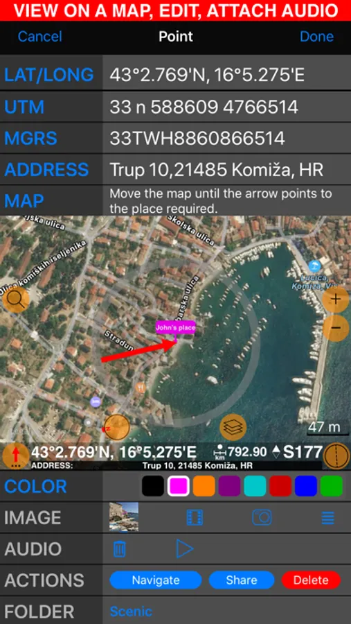Image/point location on a map can be reviewed by tapping on a MAP button in the point editor screen (MENU > POINTS > tap on a point row).