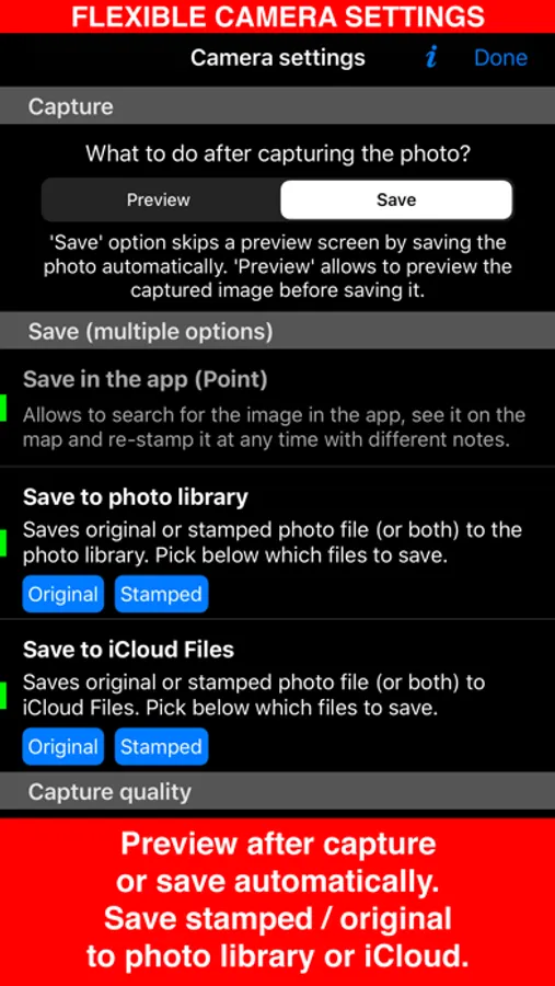Option to save copy of the photo to the photo library, either or both original and stamped photo.