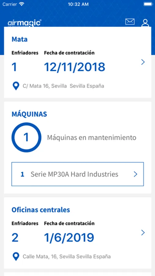 Con la App de Airmagic® ponemos a disposición de nuestros clientes una herramienta para llevar el seguimiento técnico de sus instalaciones, pudiendo ver todos los datos referentes a las intervenciones realizadas en sus distintas máquinas, los mantenimientos llevados a cabo o quiénes están asignados como técnicos a cada una, entre otras funcionalidades específicas para el cliente.