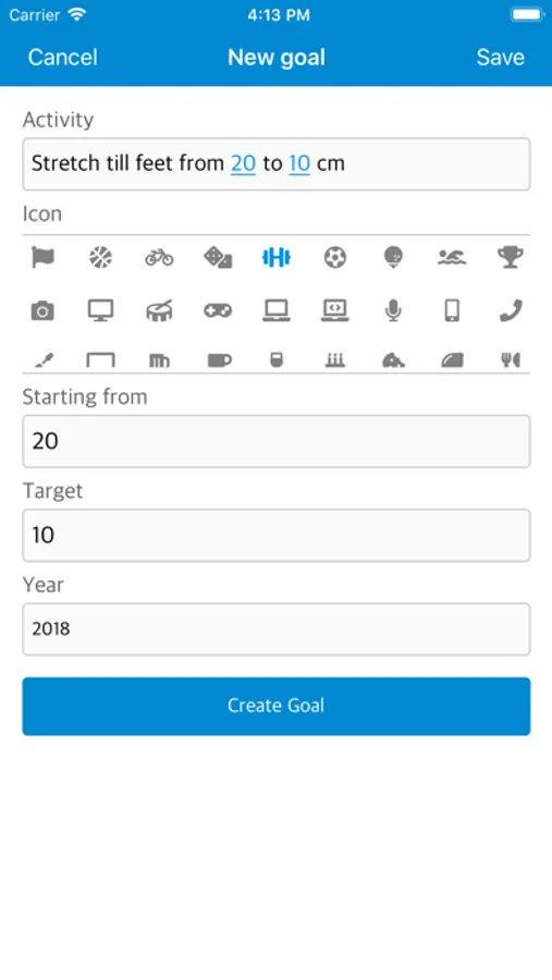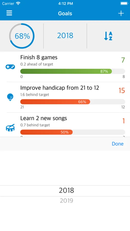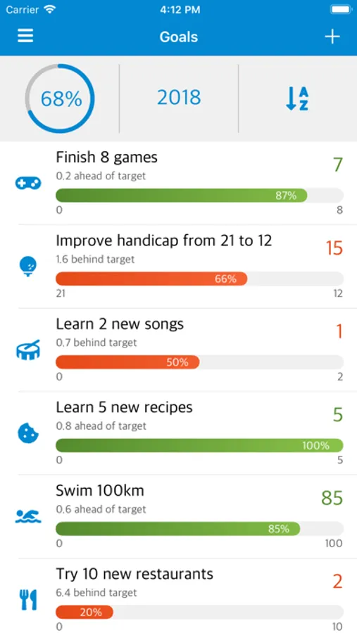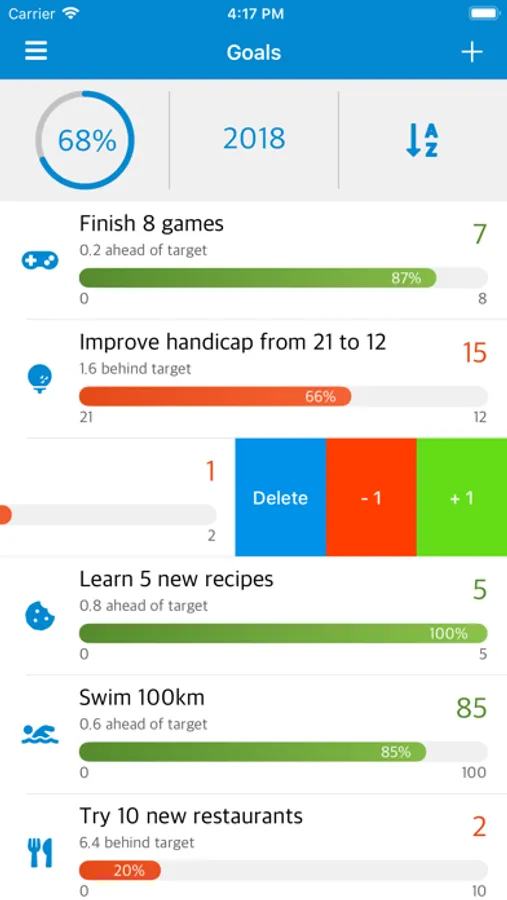 - Add goals, assign a category. You can even track goals with offsets or with countdowns such as golf handicaps