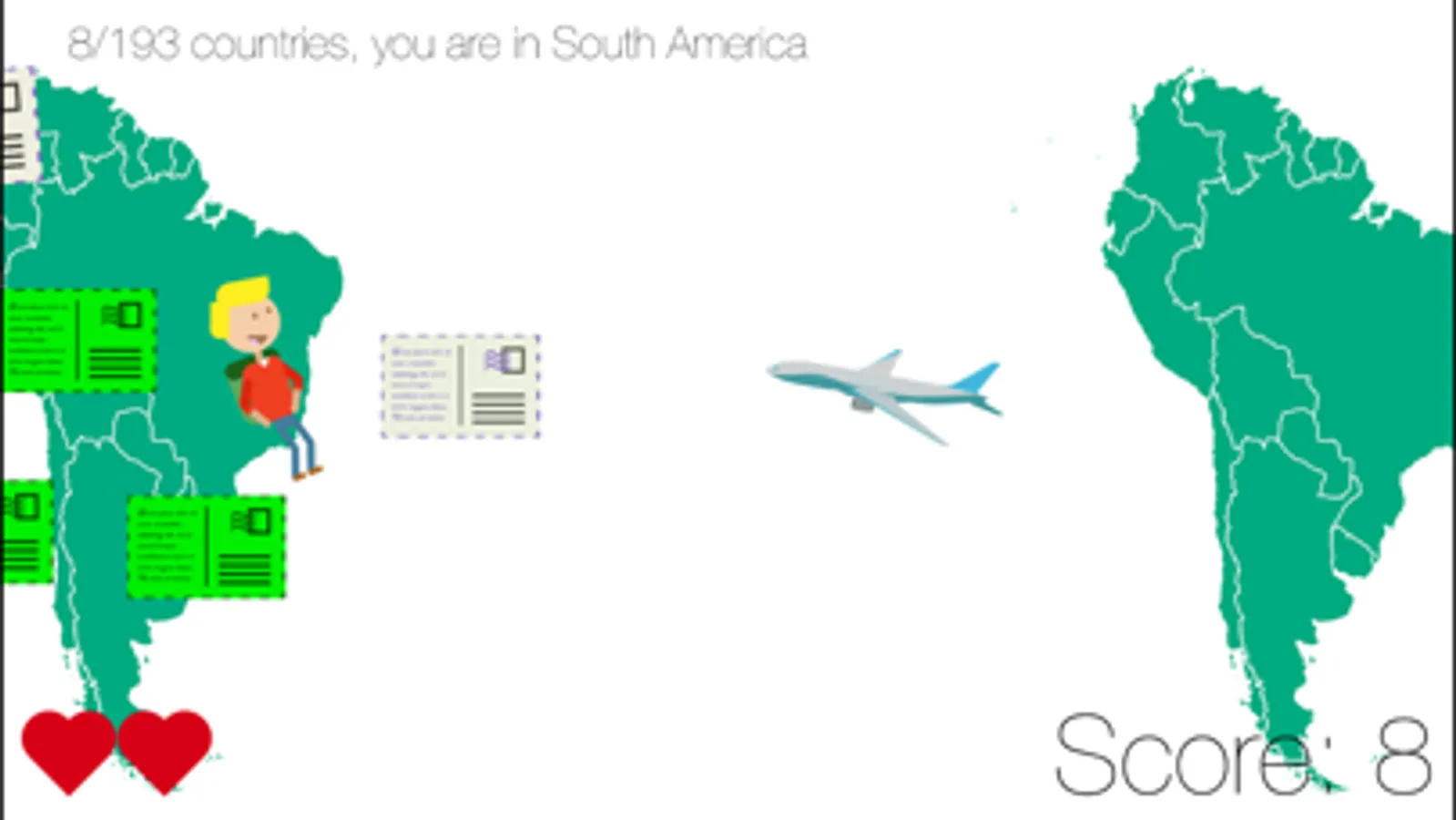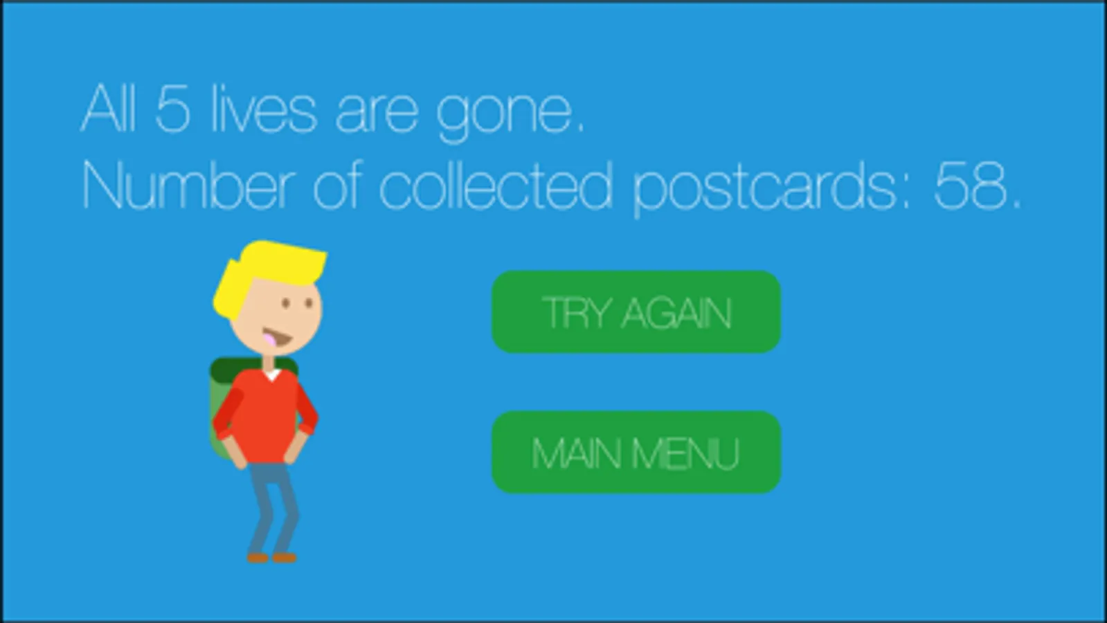 You are a traveler. Collect as many postcards as possible before you lose all 5 lives! Be careful, the planes aren’t your friends, better to avoid them.