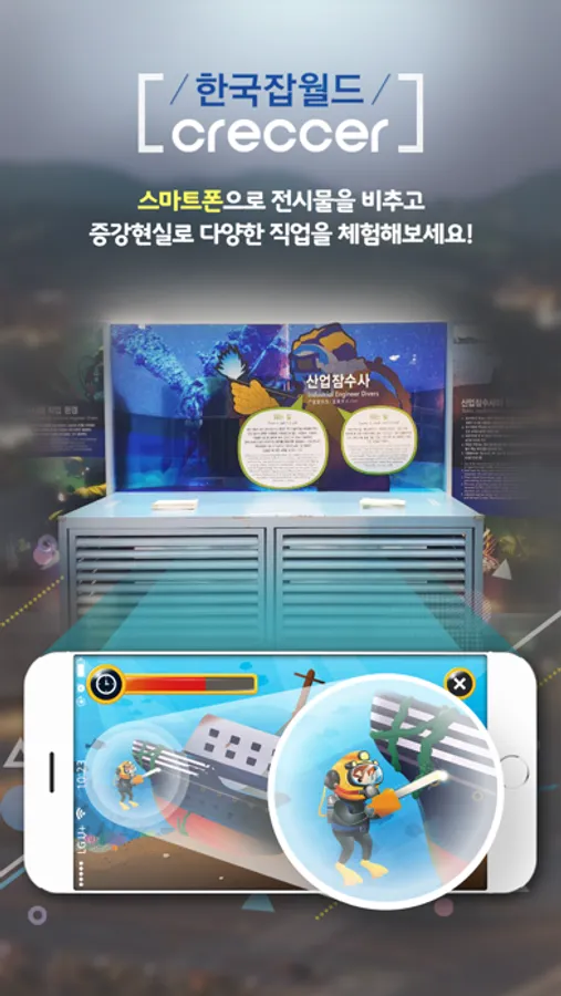 [한국잡월드 크래커]는 스마트폰을 사용해 한국잡월드 직업세계관에서 증강현실 게임, 직업관련 퀴즈 등의 미션을 해결하는 방식의 체험서비스 입니다.