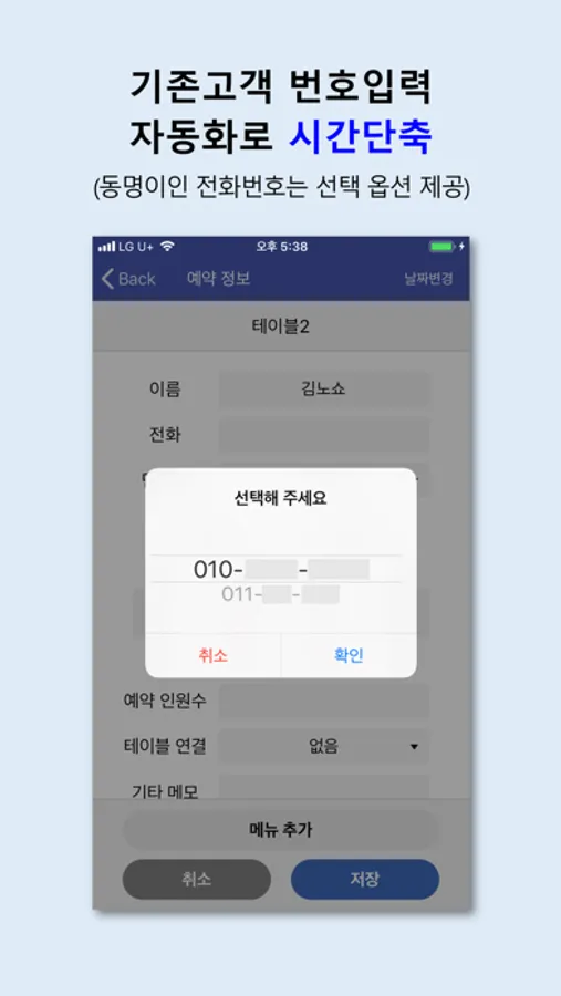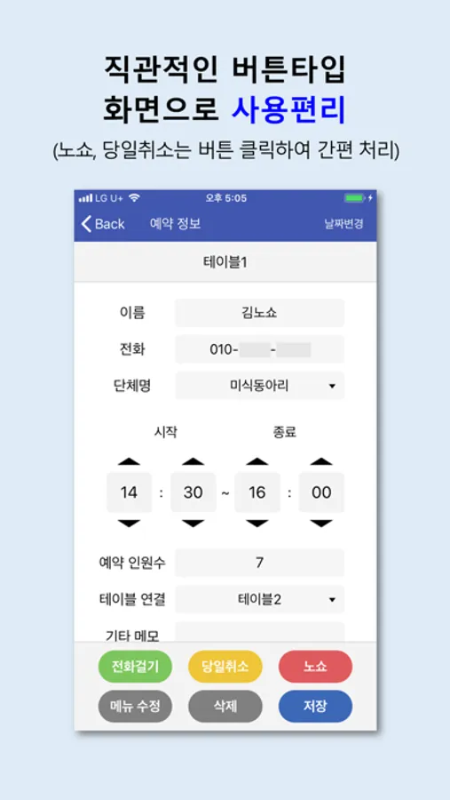 스마트폰으로 전화를 받지 않고 수기로 예약정보만 입력하는 경우에도 전화번호만 입력하면 이름과 노쇼 이력 확인이 가능합니다.