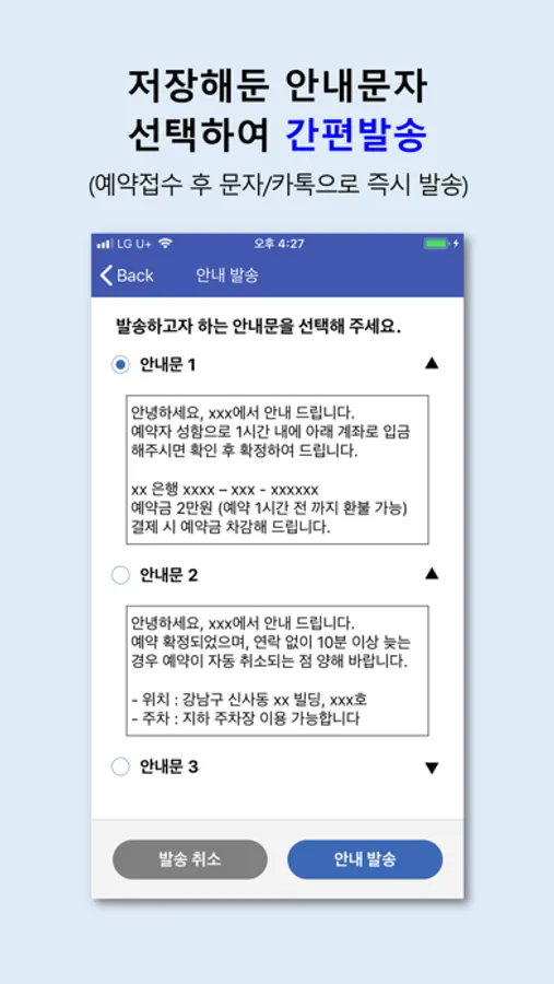 ▷ 저장해둔 안내문을 선택하여 편리하게 문자/카톡으로 발송
