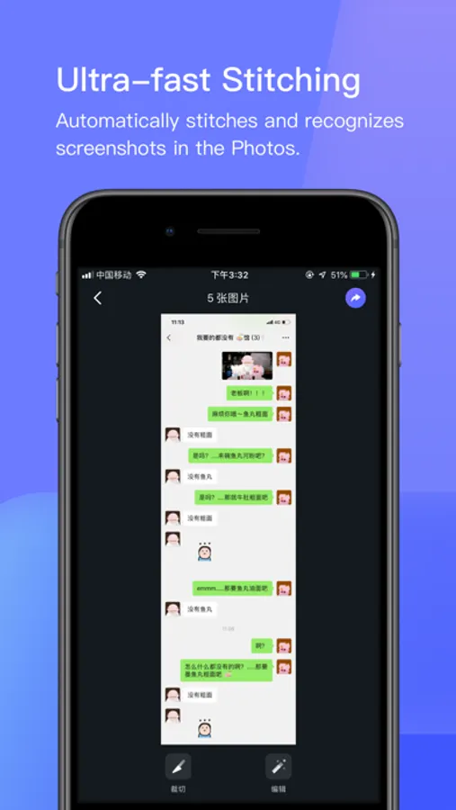 Stiiitch can be used in chat history, WeChat, QQ, SMS text; save and share of WeChat subscriptions, long articles in Apps, bills, checklists.