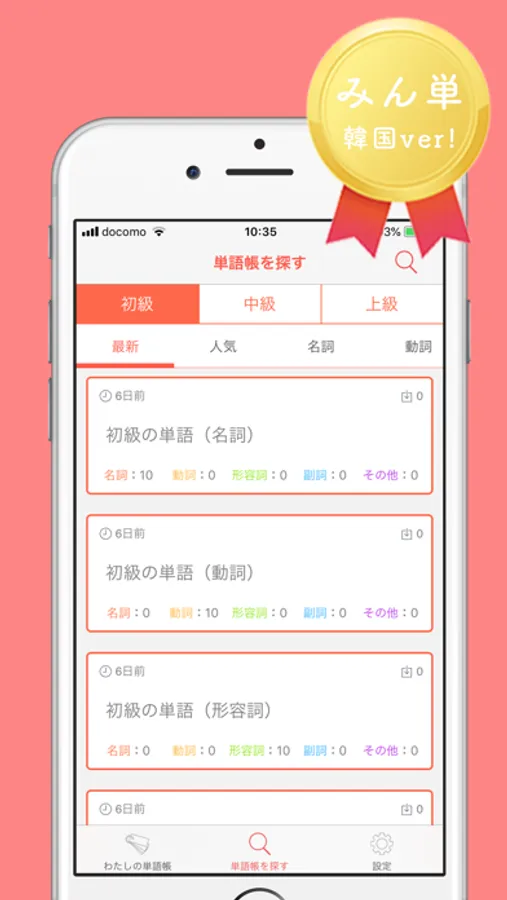 自分でオリジナル韓単語帳を作れることはもちろん、みんなが作った韓単語帳を手軽に遊べるのでみんなの韓単語をどんどんクリアしてマイスコアを伸ばしていこう!!