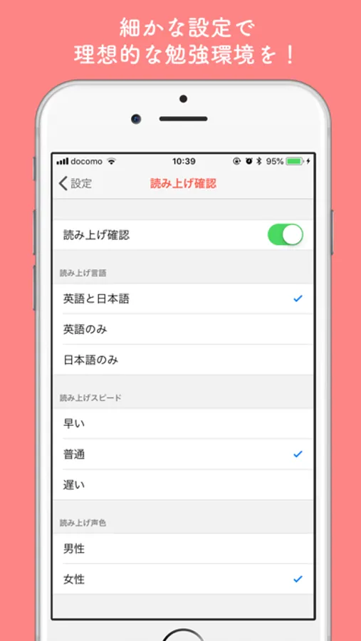 さらに、出題スピードや音声読み上げ機能の設定も可能です。