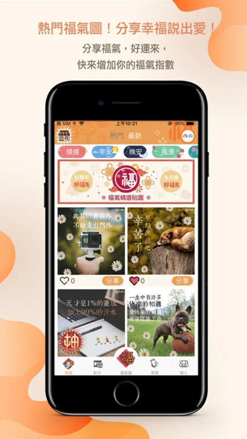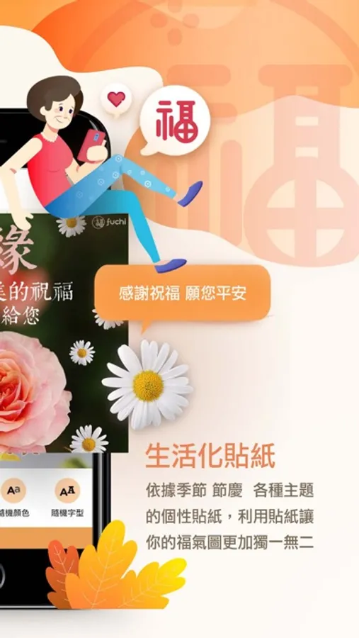 上傳爸爸媽媽、兒子女兒、孫子孫女、親朋好友或是阿貓阿狗的照片,寫上您最真誠的話語,再貼上貼圖,製作出專屬於您的獨一無二的福氣圖!