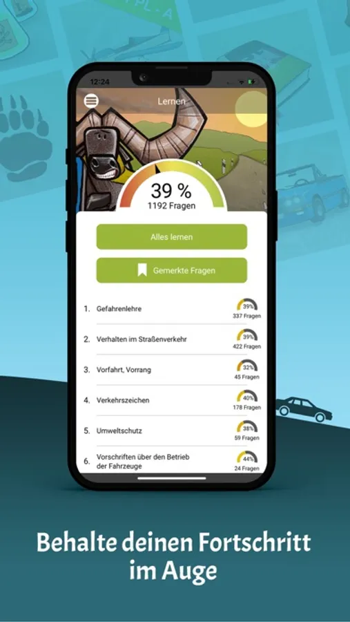 Wie in einem intelligenten Karteikartensystem wiederholt unsere App alle Prüfungsfragen aus offiziellen Fragenkatalogen. Unser System wiederholt dabei vorrangig die Fragen, die du falsch beantwortet hast, bis du den Lernstoff für deine Prüfung sicher kannst. Das Büffeln.Net Lern-O-Meter hilft dir dabei, deinen Lernfortschritt besser im Auge zu behalten.