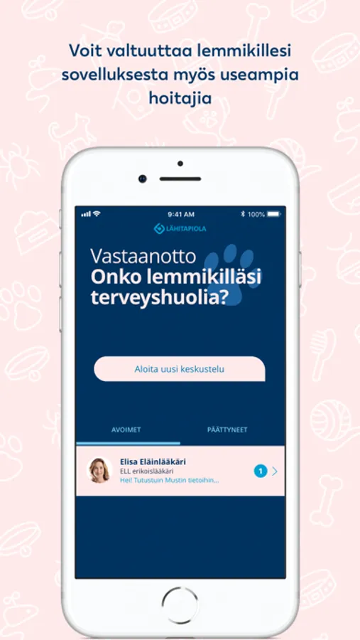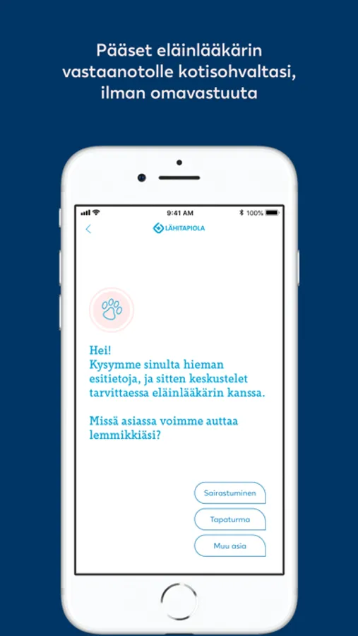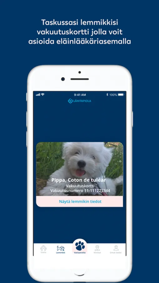LemmikkiHelpissä pääset helposti keskustelemaan etäeläinlääkärin kanssa chattia ja videoyhteyttä hyödyntäen. Sovelluksesta näet lisäksi helposti LähiTapiolan eläinklinikkakumppanit yhteystietoineen ja aukioloaikoineen. Sovellus sisältää myös lemmikkisi vakuustiedot ja sitä näyttämällä vakuutusasiointi on entistäkin sujuvampaa LähiTapiolan kumppanieläinklinikoilla ja eläinsairaaloissa.
