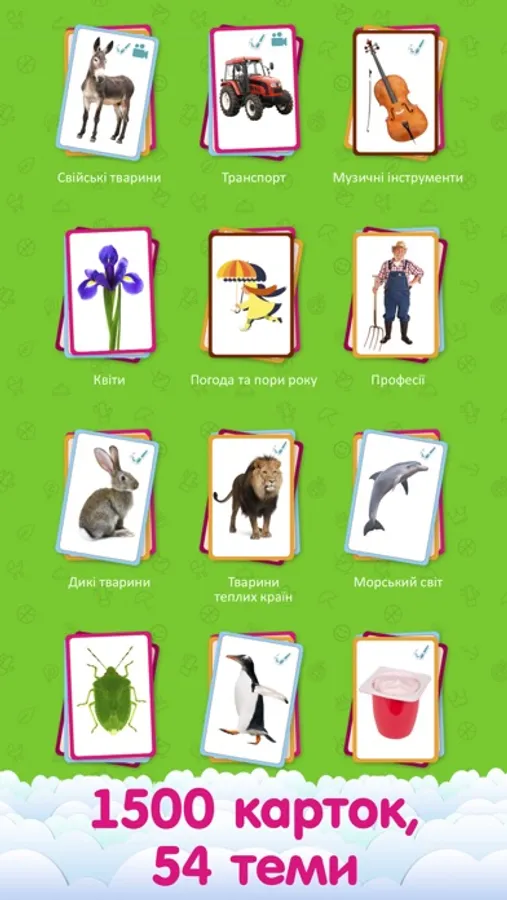 • величезна колекція з 1500 карток, розбитих на 54 теми:"
