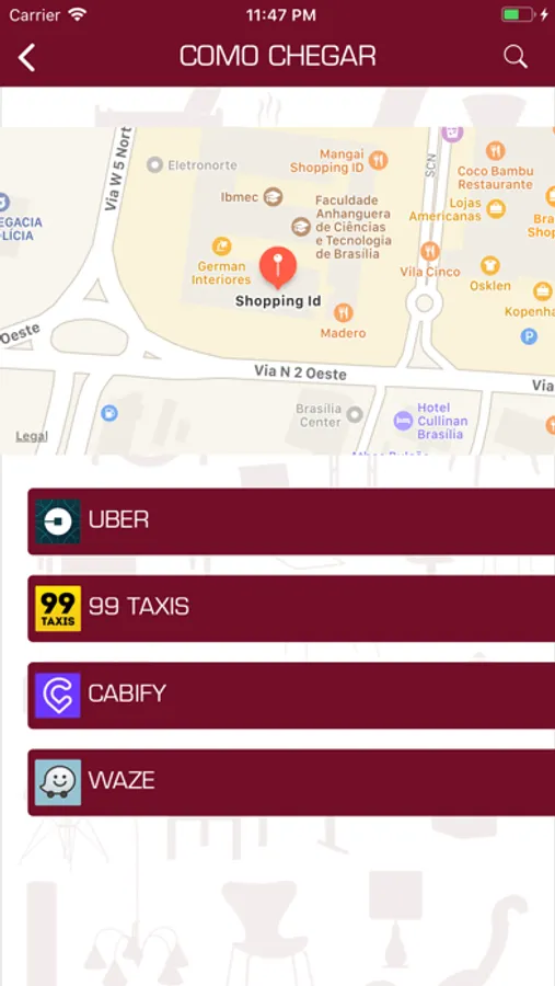 Na aba “Como Chegar” veja a localização do Shopping ID e acesse os atalhos dos seus aplicativos de GPS e de táxi favoritos.