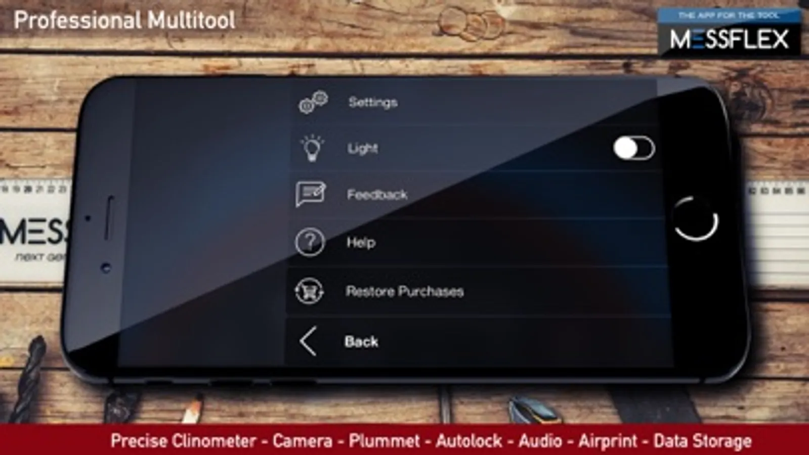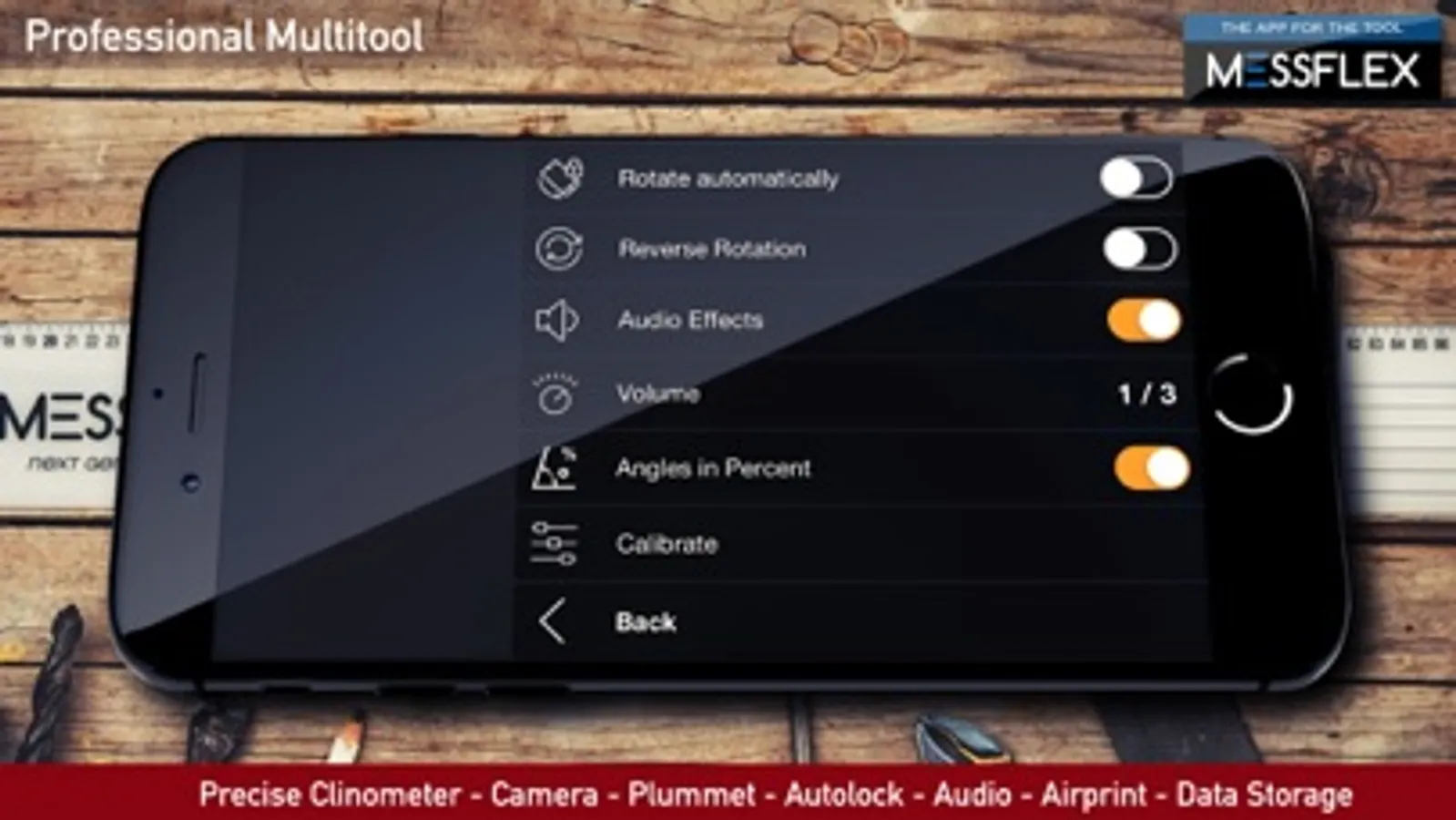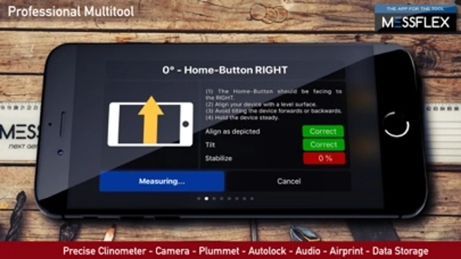 Use the clinometer to measure angles along all edges of your iPhone. Additionally you can store an unlimited number of angles in the angle list and recall them quickly as target angles.