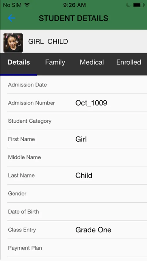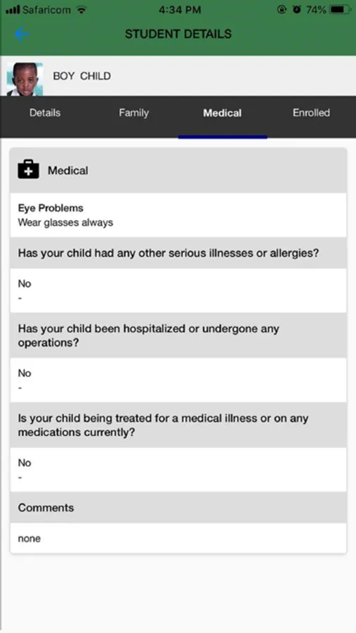 o The parent can view their child’s profile information as captured in the school database e.g. the family information , profile picture, emergency contact given and if there are any changes to be done they can have the school capture the correct details