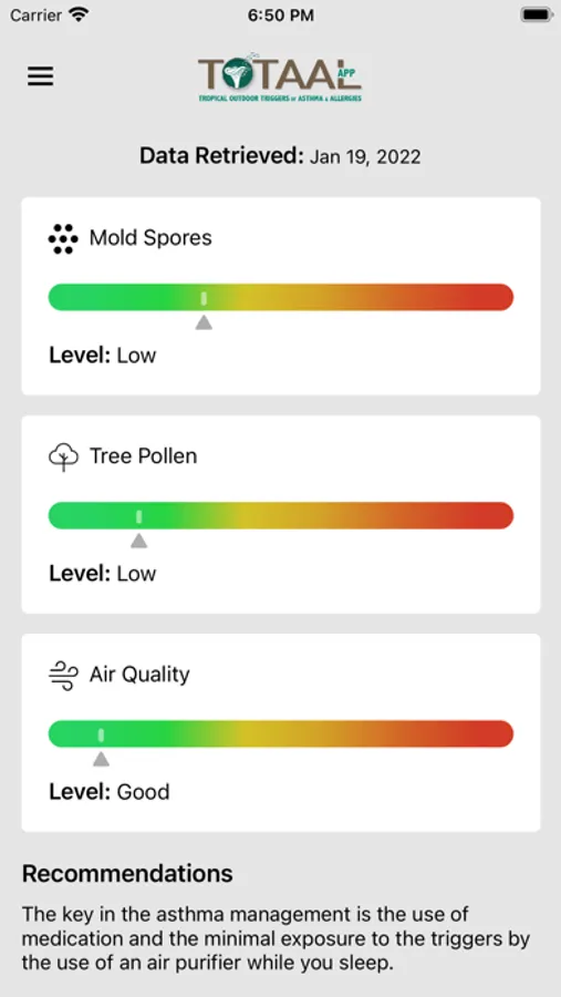 Tropical Outdoor Triggers of Asthma and Allergies (TOTAAL) application is a free app that provides levels of pollen and fungal spores for the benefit of allergy sufferers. TOTAAL app is helpful for individuals with allergies, specifically fungal spores that triggers allergies of the eyes (allergic conjunctivitis), the nose(allergic rhinitis), the skin (atopic dermatitis/eczema and or hives) and those with asthma.