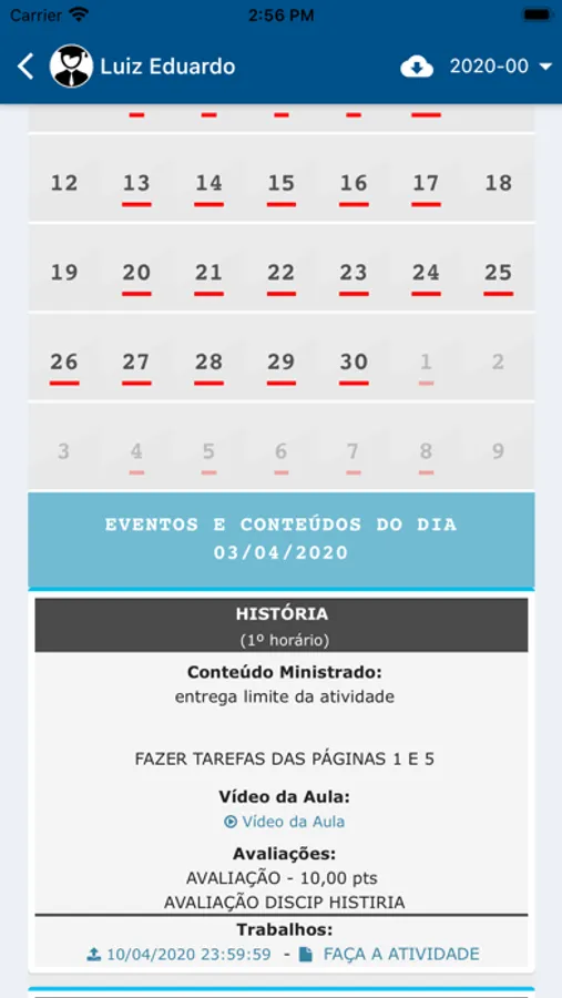 Aulas - conteúdos, horários e datas de entrega visíveis na tela;